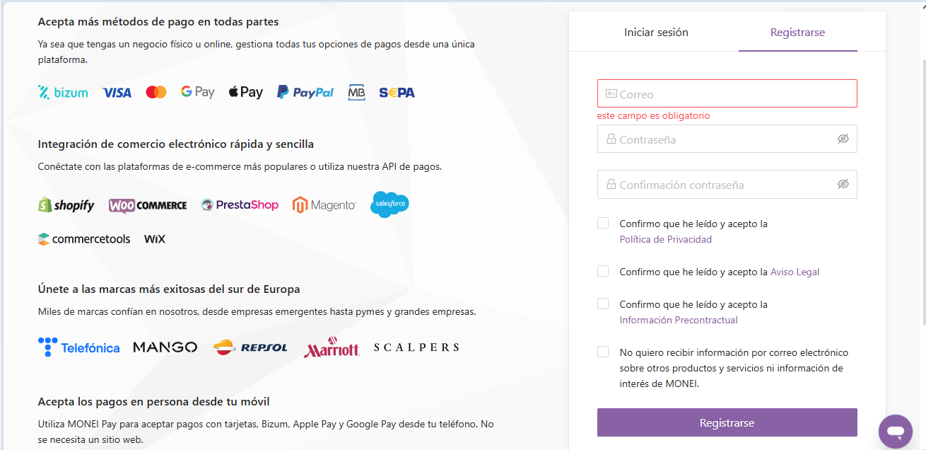 Para hacer un correcto egistro en Monei, va a dirigirse al url: